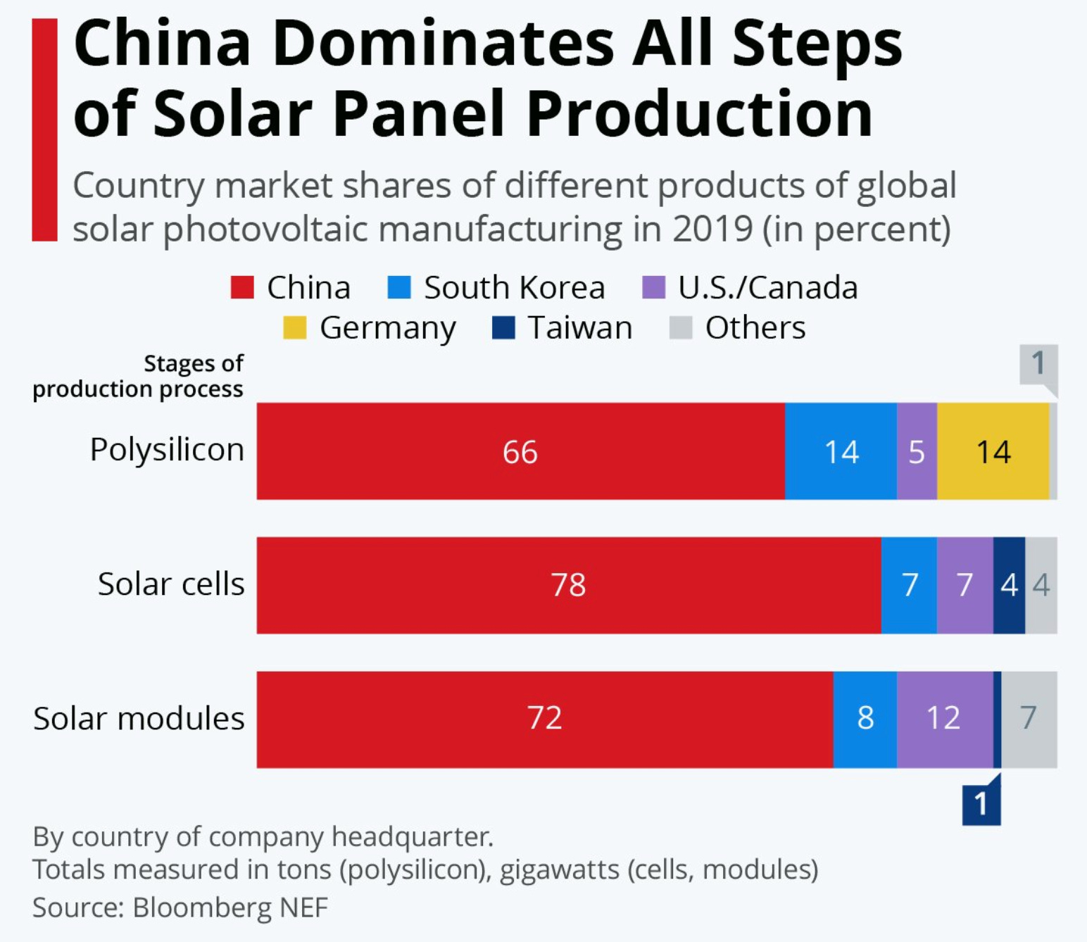 In the beginning, Chinese manufacturers made American-designed panels cheaper. Then they redesigned the entire manufacturing process to make better panels. Today, China holds most of the key patents in solar manufacturing and produces over 80% of global panels.