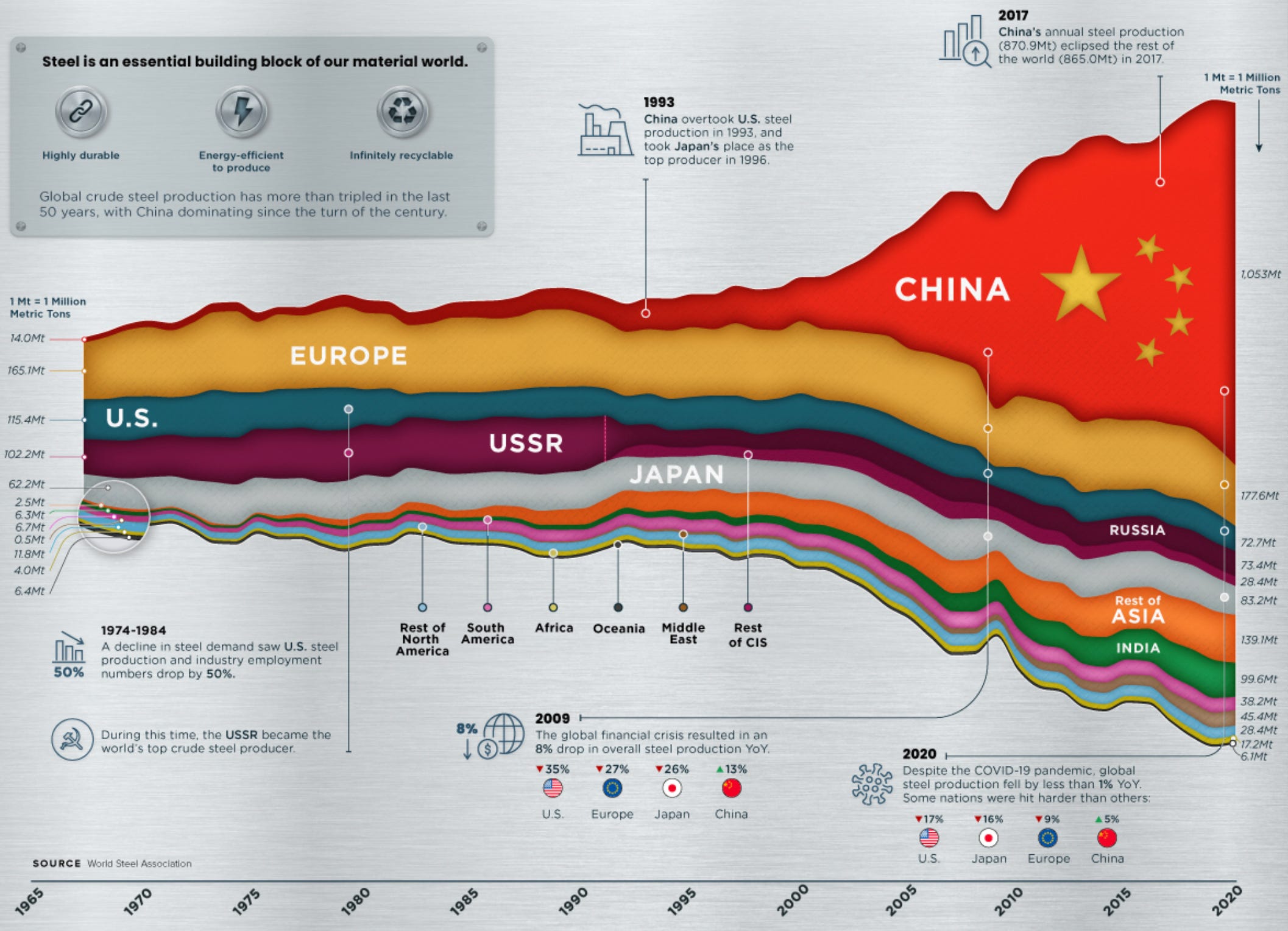In 1953, manufacturing employed one in three American workers and generated 28% of GDP. Today both figures have collapsed to under 10%. In 1944 at peak wartime steel production, we made around 80 million tons of steel annually. We still make that much today. But that 80 million tons was 60% of global production in 1944. Today it’s just 4%. Now we import around 30 million tons a year.
